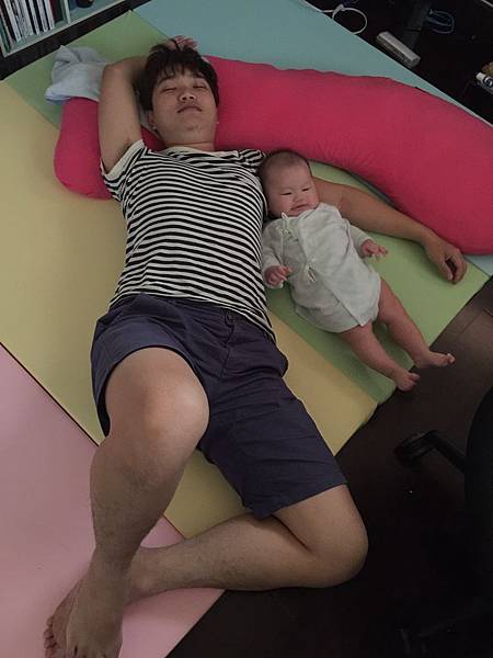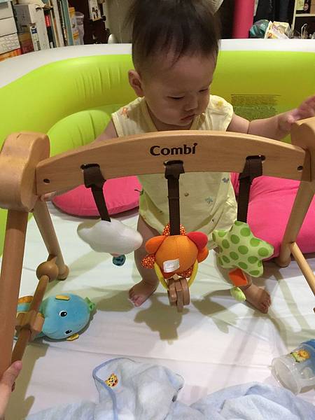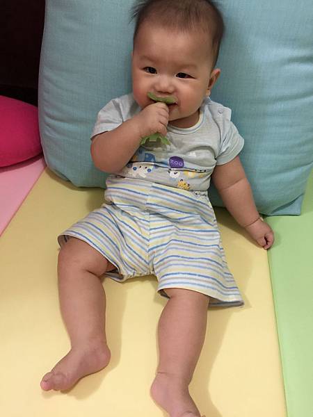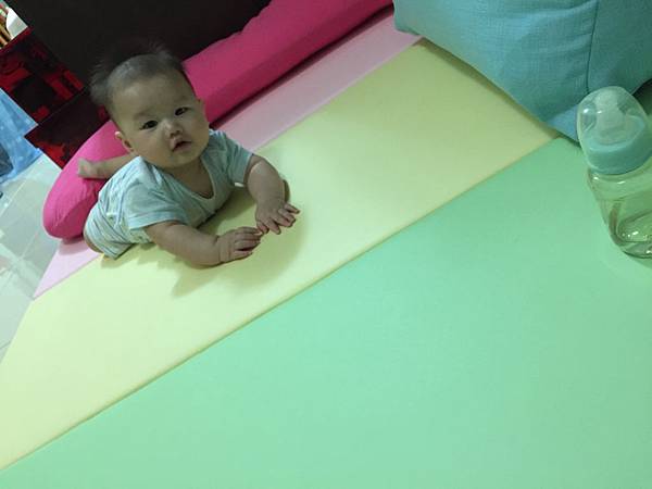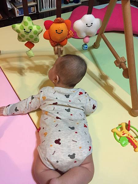 四個月後除了晚上睡覺外,其他的時間都讓BEBE在墊子上玩,連睡午覺也是在遊戲墊上。